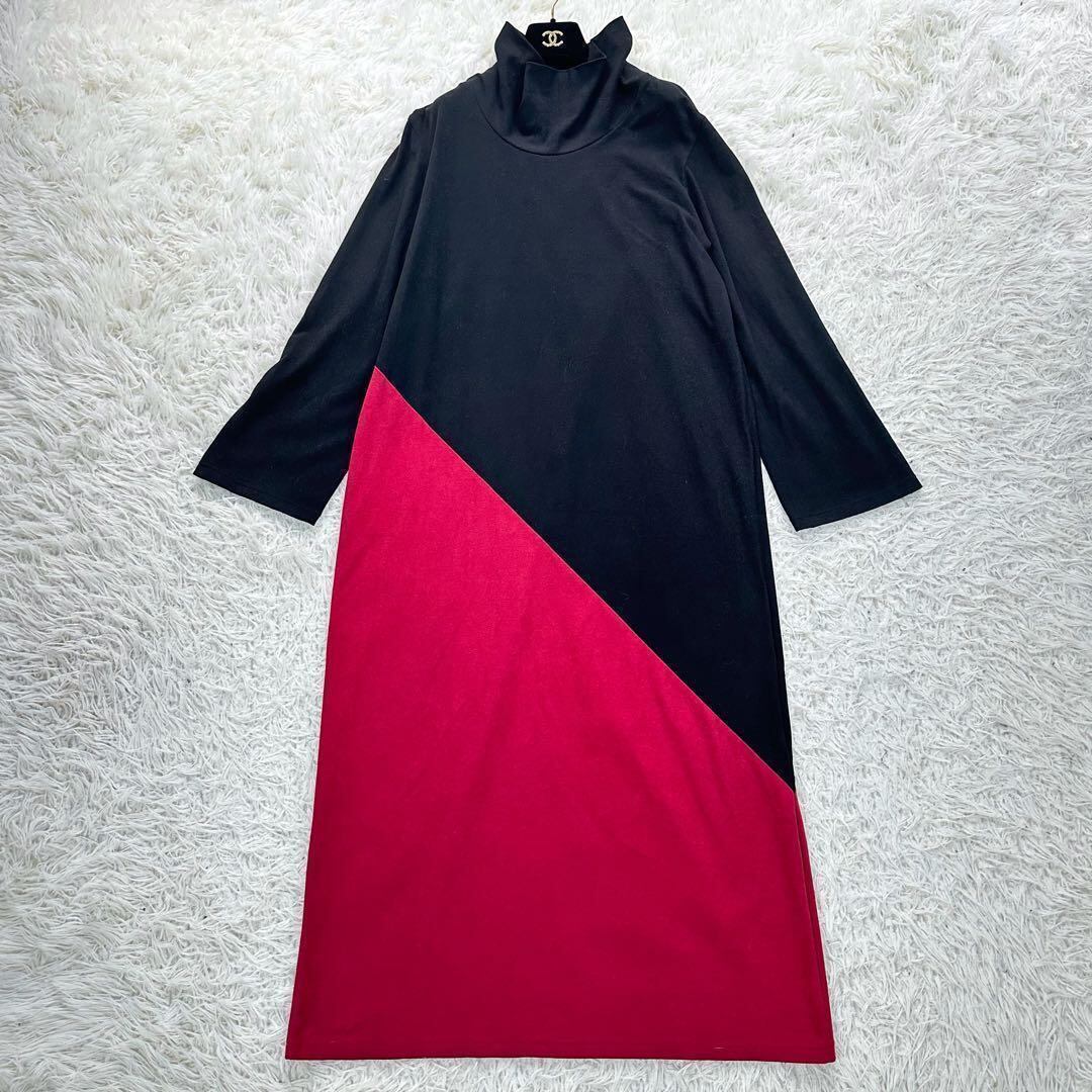 バイカラーの切り替えが印象的な、kujakuのハイネックロングワンピース。